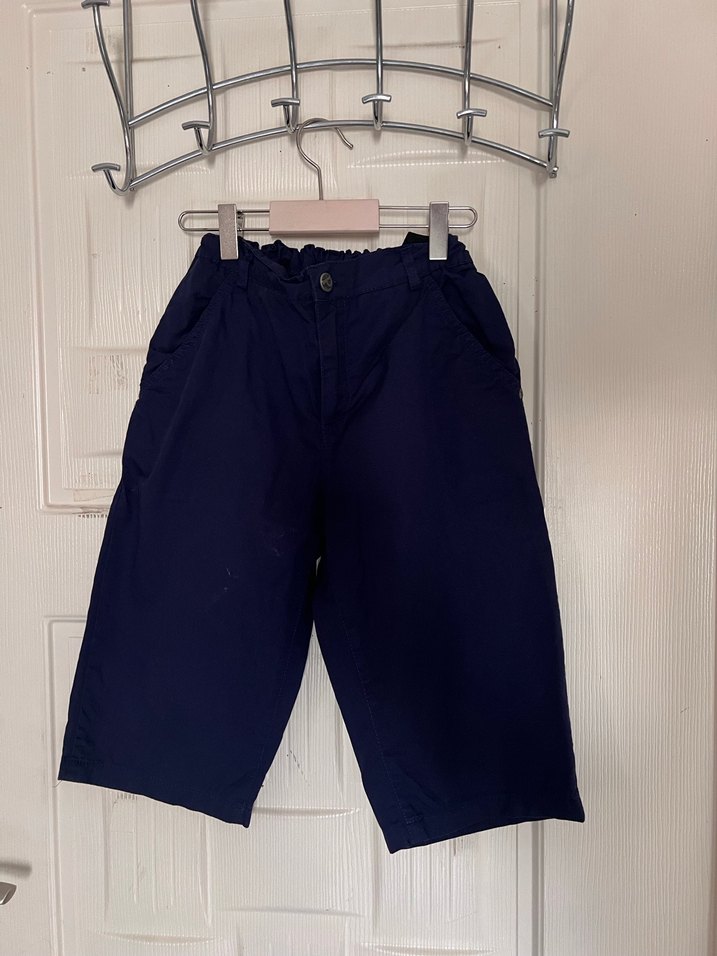Erkek çocuk için kemerli bel detayıyla lacivert bol kesim kot şort, gündelik ve trend görünümler için uygundur.