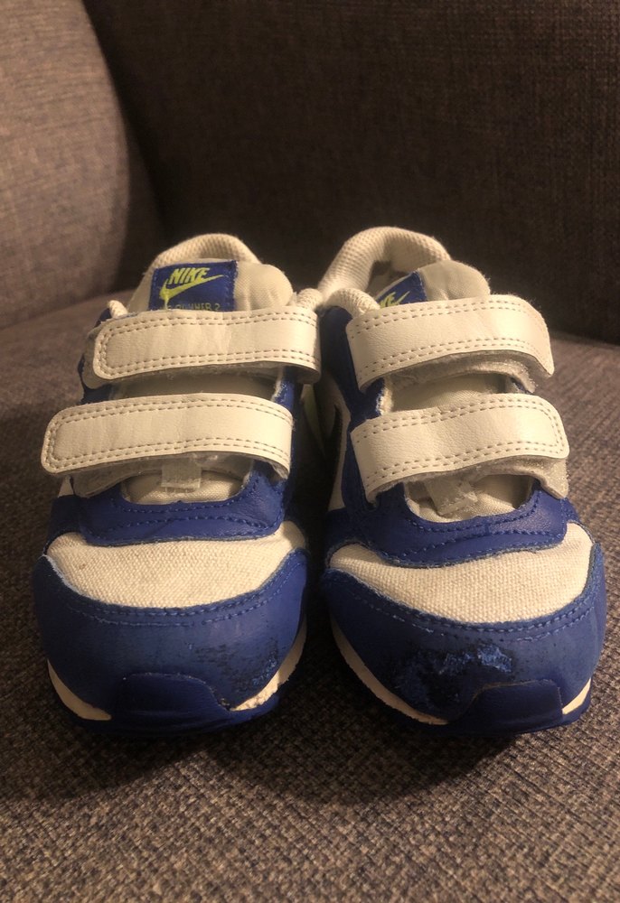Lacivert renkli, cırt cırtlı bantlara ve kauçuk tabana sahip düz tasarımlı erkek çocuk spor ayakkabısı.ön kısımda deformesi var onun harici sorunu yok