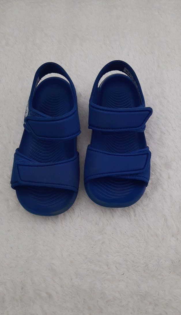 Erkek çocuklar için koyu lacivert renkte, kauçuk tabanlı ve ayarlanabilir cırtcırtlı bantlara sahip sade desenli sandaletler. 1_2 kez giyildi