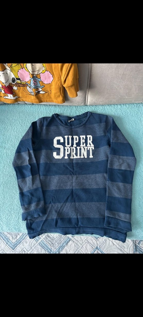 Erkek çocuk için uzun kollu, bisiklet yaka, 'SUPER PRINT' baskılı, lacivert çizgili, yumuşak ve sıcak dokulu örme sweatshirt.