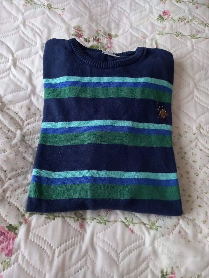 Erkek çocuk için örme kumaştan, uzun kollu ve yuvarlak yakalı, lacivert zemin üzerine yeşil ve açık mavi çizgili, bol kesim bir triko kazak. dolabımda benzer ürünler mevcut ürün birleştirme yapabilirsiniz
