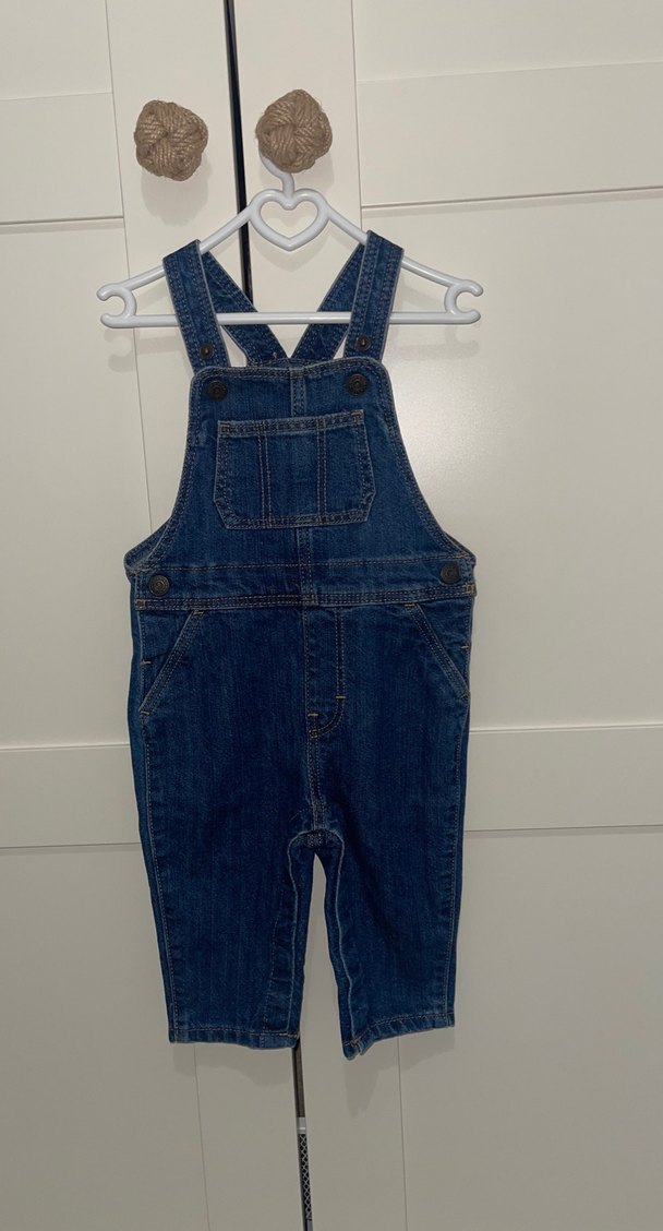 Lacivert renkli, askılı, kemerli ve ön cepli erkek çocuk için fitted kesim denim tulum. Sokak stili için uygun.