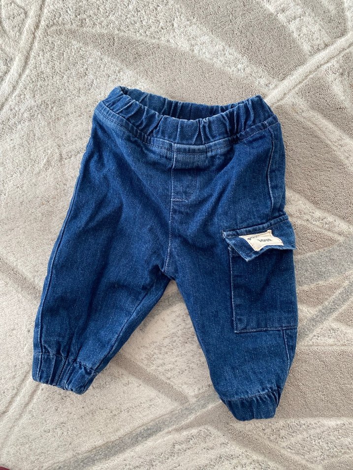 Erkek çocuklar için koyu mavi denim pantolon, bol kesim ve rahatlık için lastikli bel bandına sahip. Yan cep detayıyla trend sokak stili sunar.