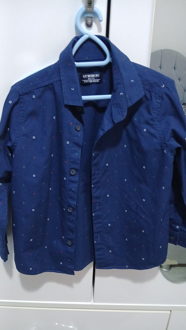 Lacivert denim gömlek, uzun kollu ve düğmeli, erkek çocuklar için notched lapel yakalı, loose fit ve küçük desenli, street wear tarzında.