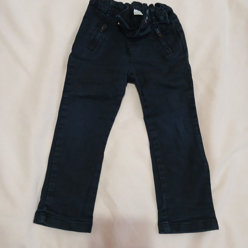Erkek çocuklar için koyu mavi denim pantolon, regular fit kesim ve fermuarlı ceplerle sade ve temel tasarım.