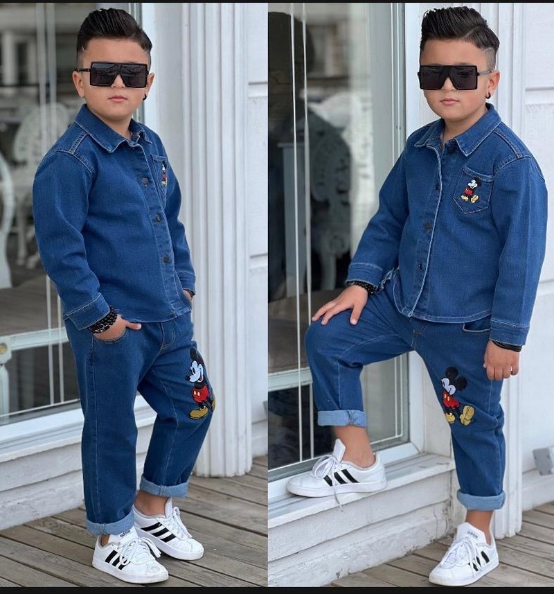 Erkek çocuklar için lacivert denimden yapılmış, düğmeli ve nakış detaylı regular fit takımdır. Sokak stili için uygundur. #kottakim
