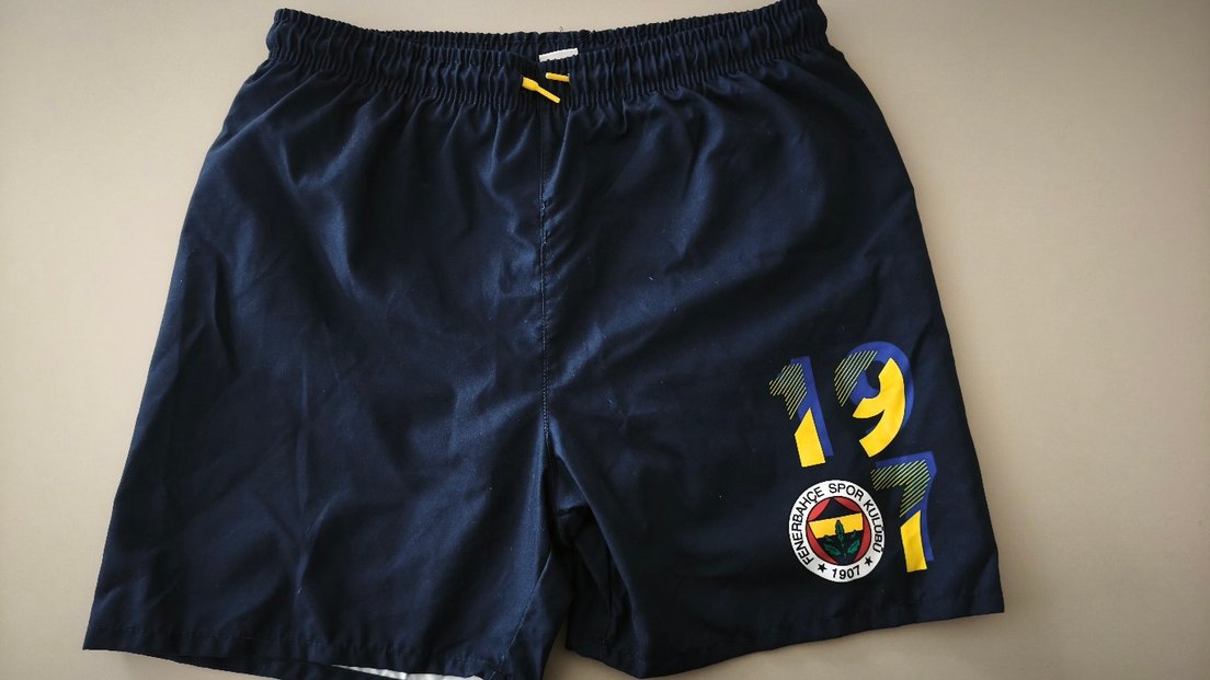 Lacivert renkli, desenli erkek çocuk mayo. Elastik bel ve bağcık detaylı, üzerinde 'SF' yazısı ve spor amblemi bulunur.