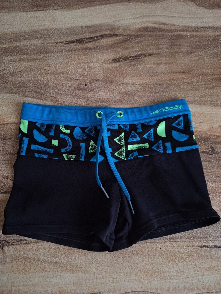 Lacivert ve desenli bel bantlı, ayarlanabilir bağcıklı erkek çocuk şort mayo. Rahat ve yüzme için uygun.
