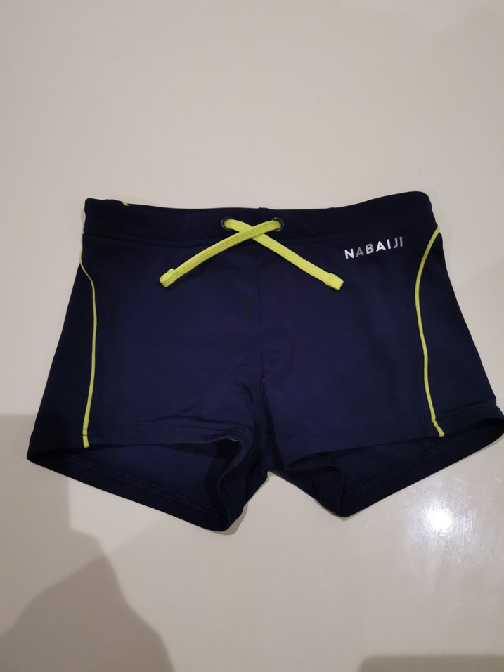 Sarı bağcık ve yan şerit detaylı, NABAIJI logolu lacivert erkek çocuk mayo.