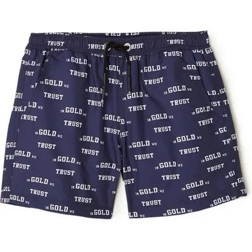 Parlak lacivert renkte, beyaz baskılı yazı desenleri ve bağcıklı lastikli bel detaylı erkek çocuk kısa kollu mayo.