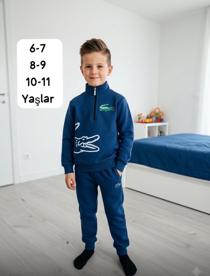 Erkek çocuklar için lacivert, fermuarlı, yüksek yakalı, yumuşak ve sıcak kumaştan, baskılı desenli street wear eşofman takımı. 6-11 yaş arası bedenler mevcuttur.