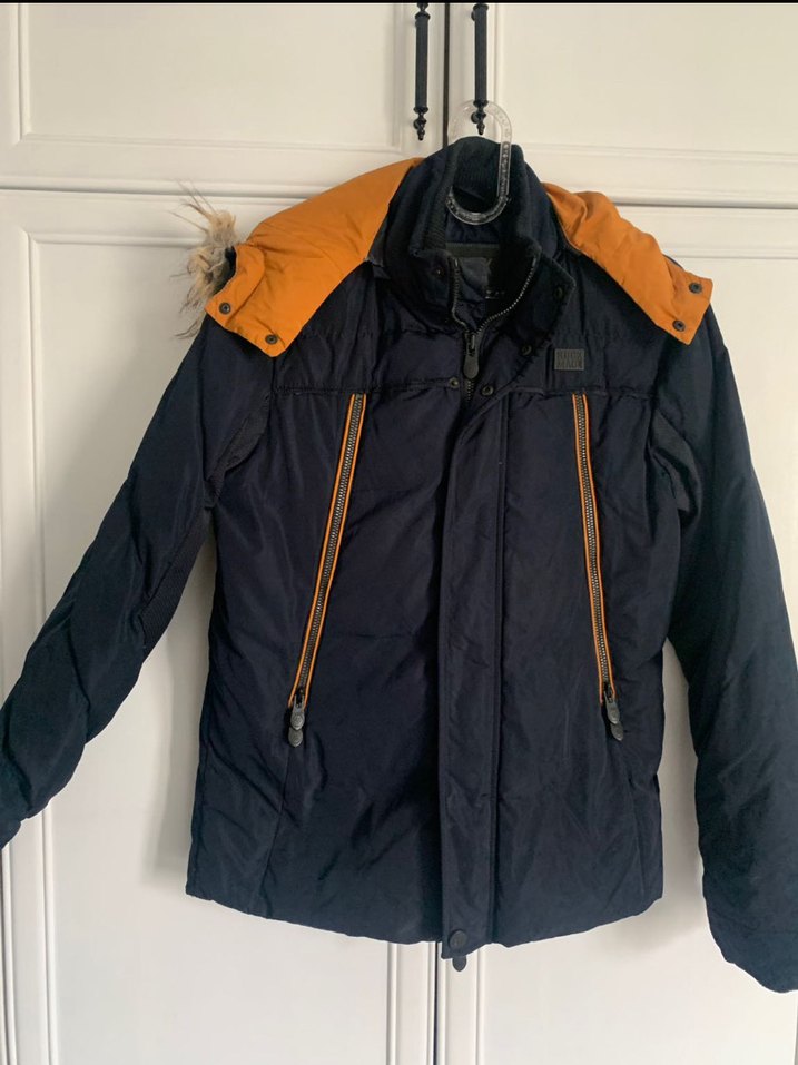 Fermuarlı ve kesik yakalı, lacivert ve turuncu kapüşonlu, ince kesim erkek çocuk kabanı. Sıcak ve yumuşak kumaştan, streetwear tarzında.