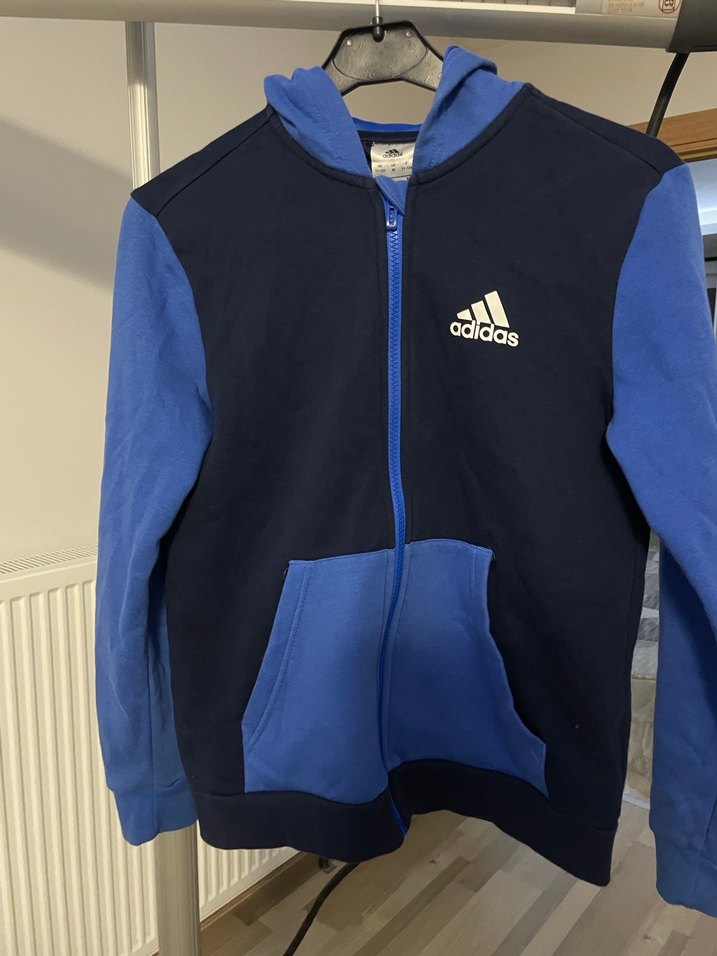 Lacivert fermuarlı, bisiklet yaka, yumuşak ve sıcak kumaştan erkek çocuk sweatshirtü. Adidas marka, baskılı ve sokak modası tarzında.