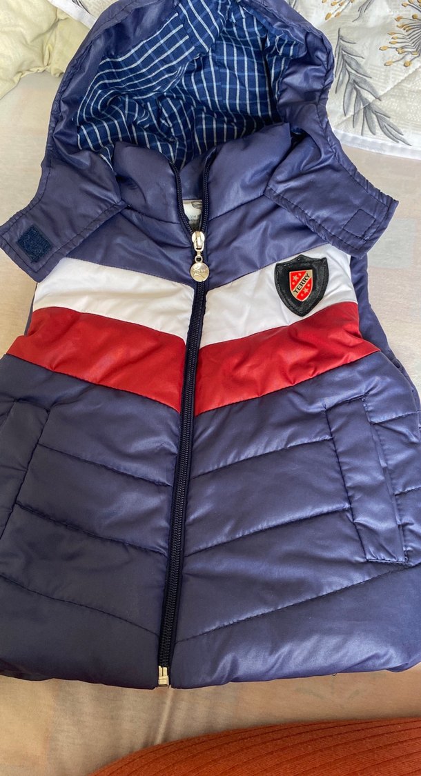 Lacivert, fermuarlı, yakası kesik erkek çocuk yeleği. Kırmızı ve beyaz şeritlerle detaylandırılmış, dar kesim ve sportif tarzda, yumuşak sıcak kumaştan.