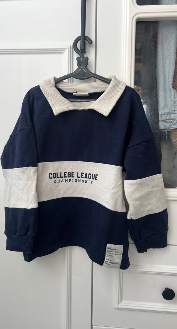 Erkek çocuk sweatshirtü, bol kesim, uzun kollu ve yakalıdır. Yumuşak, sıcak kumaştan örme dokuda olup önünde 'COLLEGE LEAGUE CHAMPIONSHIP' baskısı vardır. Lacivert ve gri renkleriyle günlük tarz sağlar.