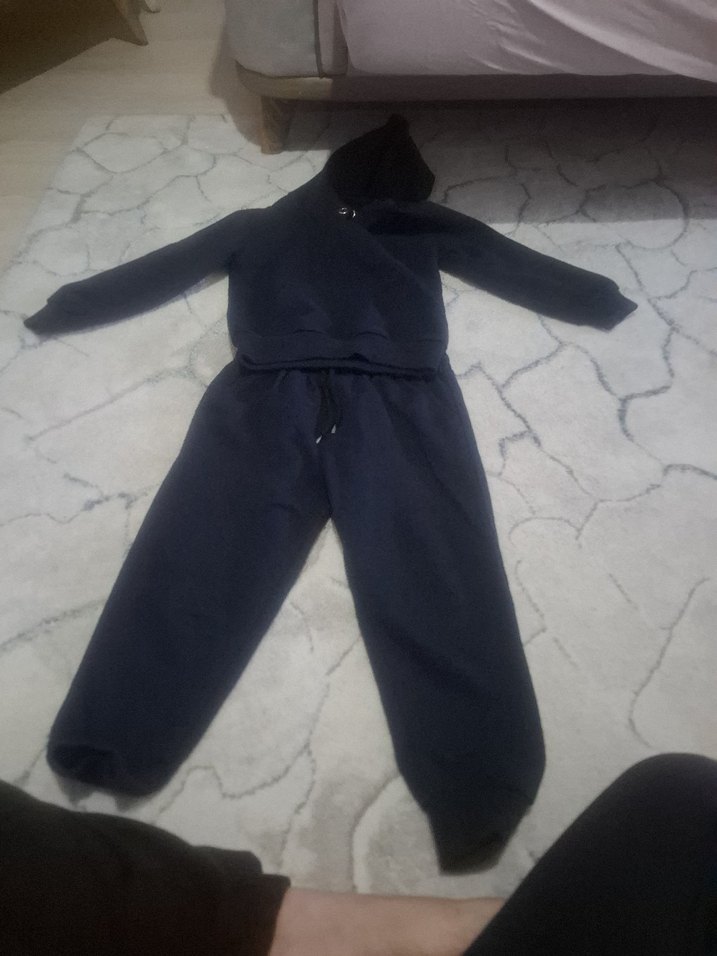 Lacivert renkli, kapişonlu ve uzun kollu erkek çocuk eşofman takımı, yumuşak ve sıcak kumaştan bol kesimle sokak tarzı sunar. ✨4-5 yaş uyumlu koyu lacivert renkte kapişonlu beli ipli sadece kapişon ipi eksik pantolonu yanlardan cepli sweati önden cepli hiçbir sorunu olmayan mevsimlik eşofman takımı kreşe giderken giymek için çok uygun