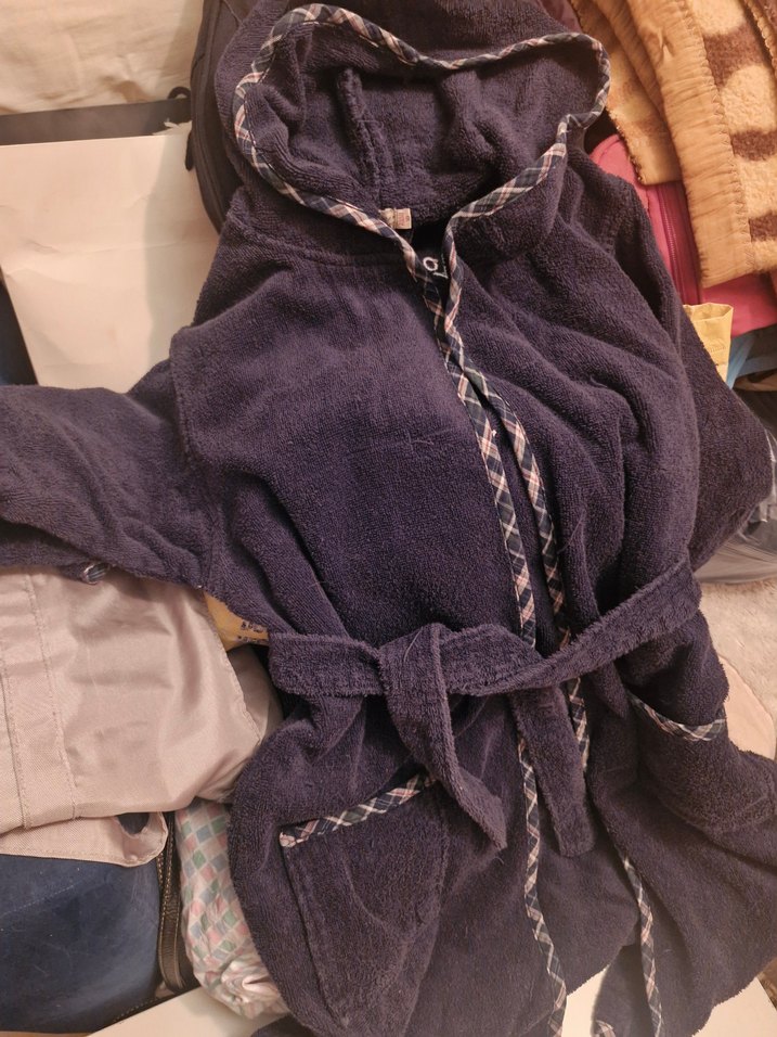 Erkek çocuklar için kapüşonlu bornoz, yumuşak dokulu ve kenarları ekose desenli kenar detaylarına sahiptir. Bazı yerlerinde çamaşır suyu lekeleri vardır.