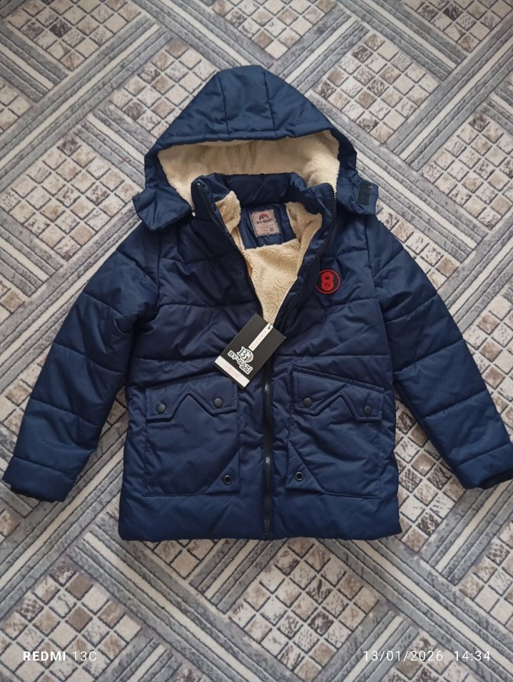 Erkek çocuklar için lacivert renkli, düğmeli ve kapüşonlu mont. Yumuşak fleece astarlı, regular fit ve notched lapel yakalı, rahat sokak stili için uygun. sıfır etiketi üzerinde çocuğa küçük olduğu için satıyorum.