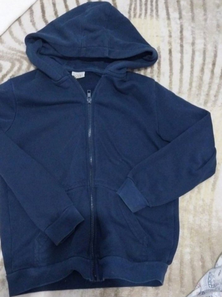 Erkek çocuklar için uzun kollu, kapüşonlu ve fermuarlı, yumuşak ve sıcak kumaştan lacivert sweatshirt. Rahat ve şık sokak stili için uygundur.