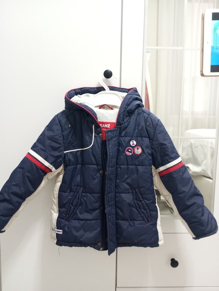 Erkek çocuklar için dar kesim, koyu mavi renkli, baskılı detaylara sahip düğmeli mont. Yaka tipi çentikli, kapüşonlu ve rahat fleece kumaştan üretilmiştir. Çok iyi durumda tertemiz sorunsuz