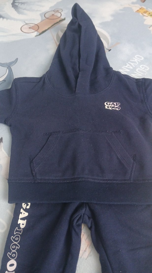 Lacivert renkli, uzun kollu, kapüşonlu ve cep detaylı, pamamsı yumuşak kumaştan erkek çocuk sweatshirtü. GAP19 baskılı. biraz tuylenme mevcut