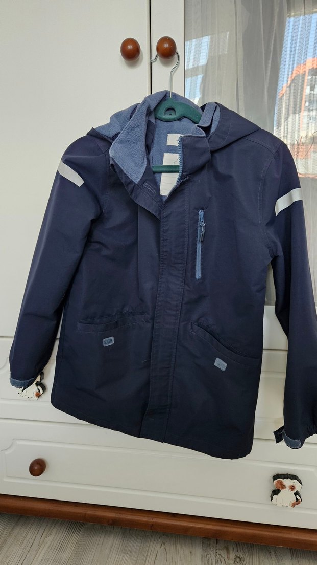 Erkek çocuklar için notched lapel yakalı, tokalı detaylara sahip lacivert yağmurluk. Mavi ve gri tonlarda, kollarında reflektör şeritler bulunur. Rahat kesim ve yumuşak kumaş kullanılmış. ️