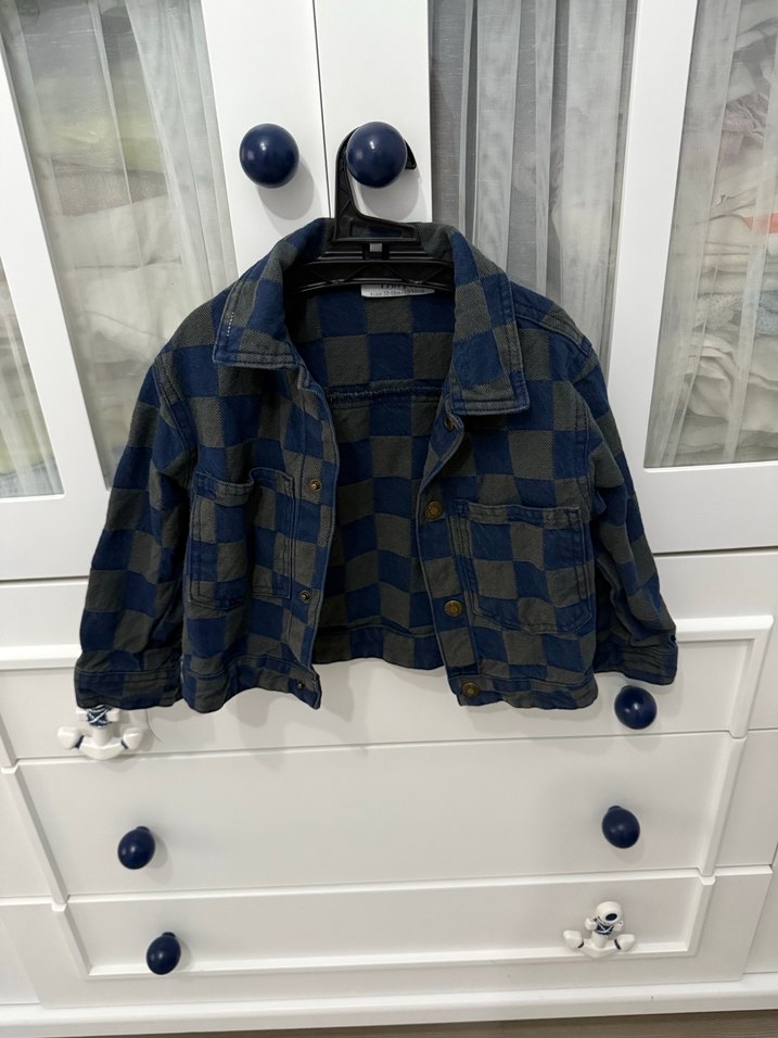 Erkek çocuk için lacivert kareli desenli, düğmeli, bol kesim denim ceket. Notlu yaka tasarımıyla günlük rahat stil sunar.