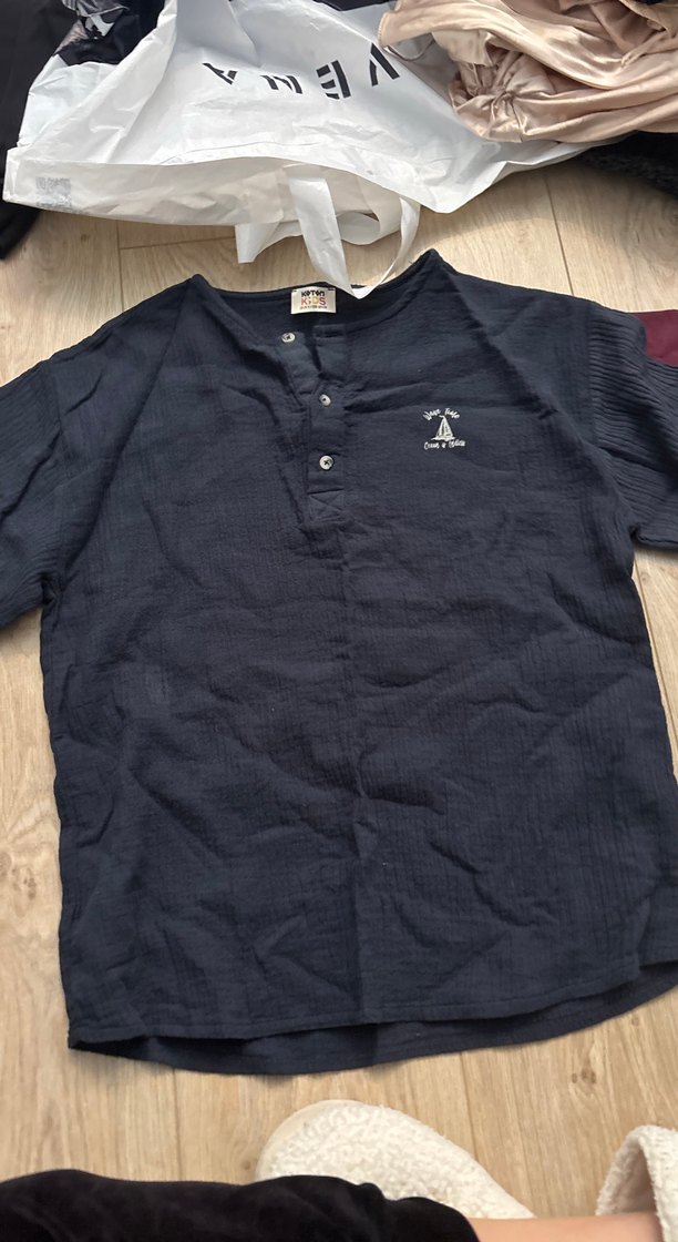 Lacivert müslin kumaştan, kısa kollu, bol kesim erkek gömleği. Düğmeli, yuvarlak yakalı ve bohem tarzda, trend şıklık için uygun.