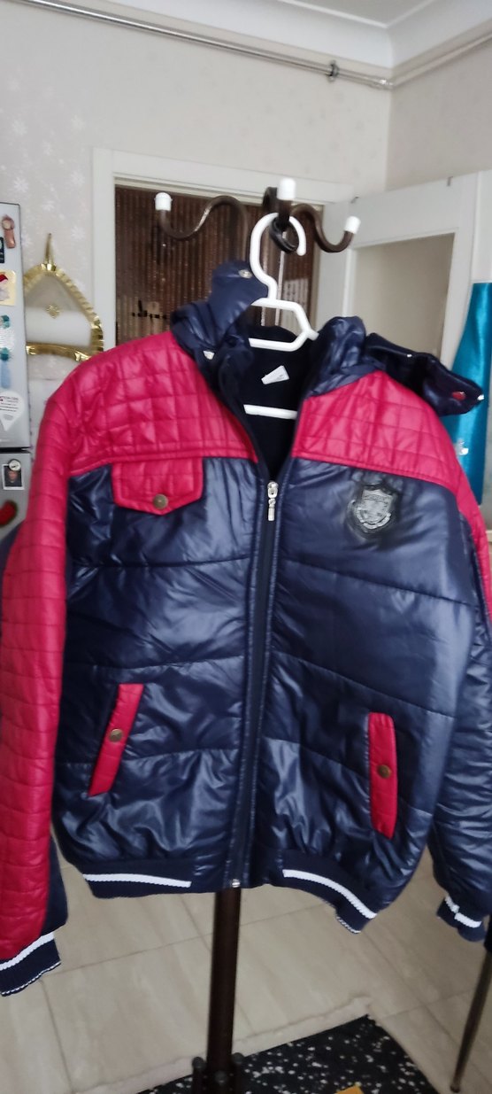 Erkek çocuklar için lacivert ve kırmızı renklerde, fermuarlı, notched lapel yakalı, sentetik kumaştan yapılmış, fitted kesim sokak stili mont.