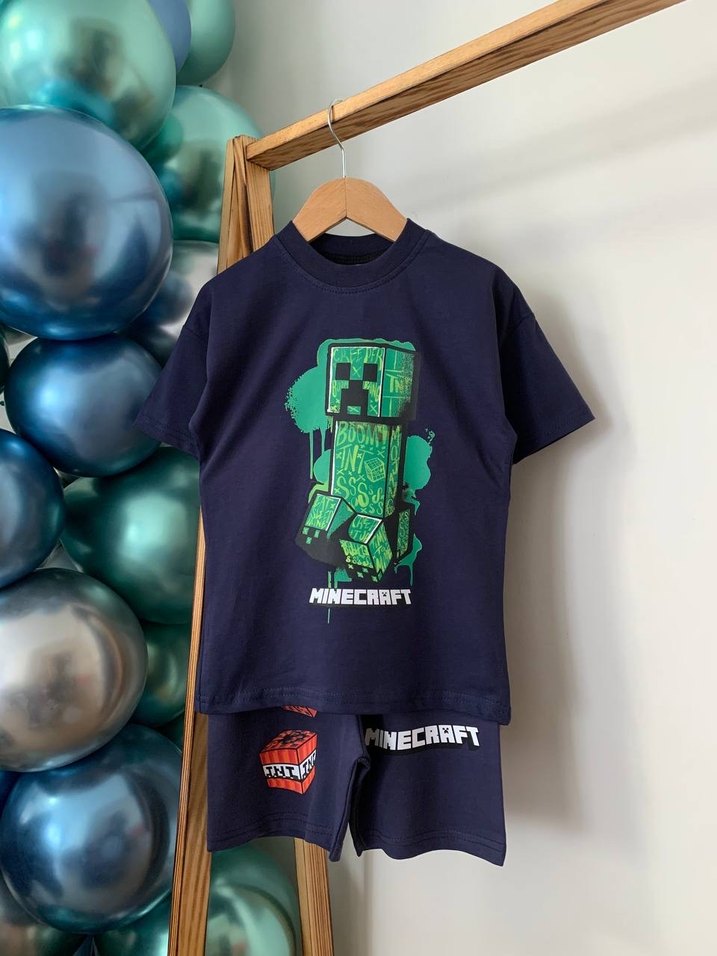 Erkek çocuklar için koyu mavi denim tişört, rahat kesim, kısa kollu ve bisiklet yaka. Minecraft baskısı ile sokak stilini yansıtıyor. 34
