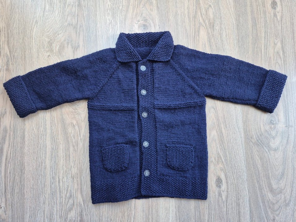 Lacivert renkli, örgü erkek çocuk hırkasıdır. Bol kesim, uzun kollu ve önünde cepleri vardır. Düğmeli ve yakalı sade bir tasarıma sahiptir.