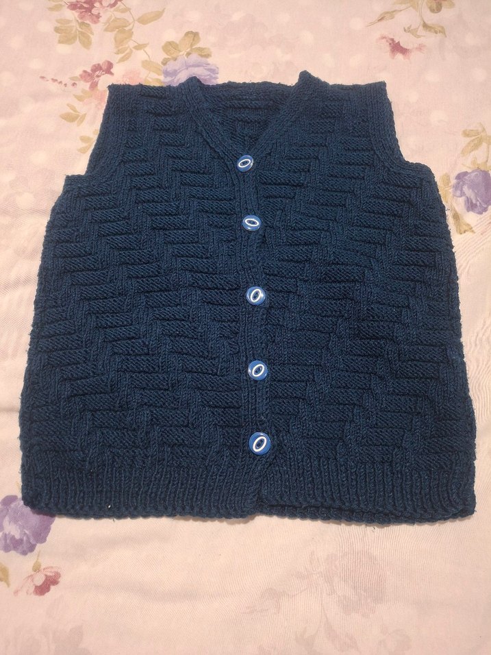 Lacivert renkli, erkek çocuklar için örme, kolsuz ve V yaka süveter. Düğmeli ve düz desensiz, vücuda oturan kesime sahiptir. hiçbir sorunu yok oğluma küçük geldiği için satışta 3.4.5 yaşa uygun