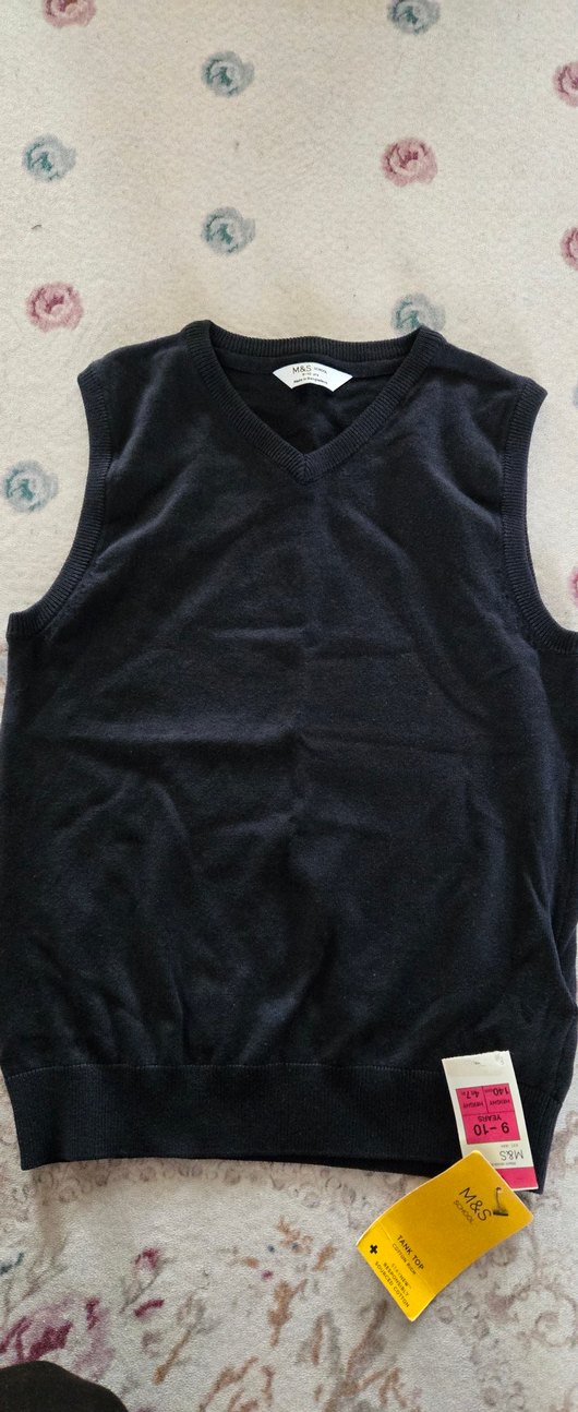 Pamuklu, siyah, kolsuz ve V yaka olan bu erkek çocuk süveteri, sade ve şık bir sokak stili sunar. yeni ve etiketlidir rengi göründüğü gibi.