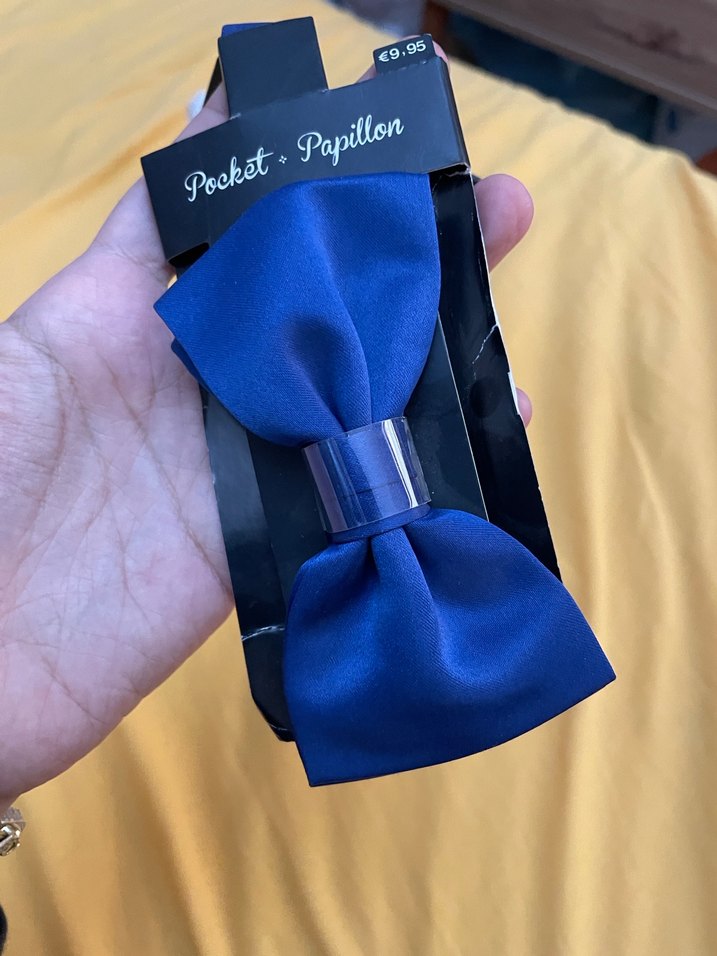 Erkek çocuk için koyu lacivert papyon, yumuşak kumaş ve hafif batik desenli. Ortasında şık metal detay bulunur. Pocket + Papillon markasıdır. İtaliadan aldım