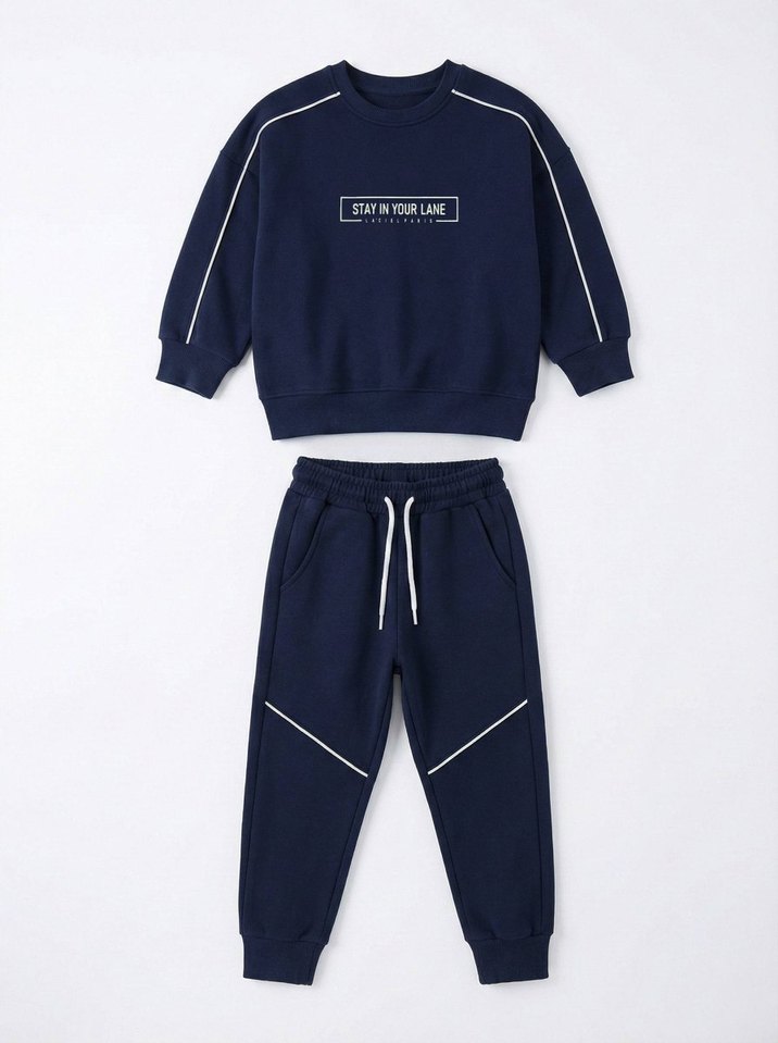 Erkek çocuklar için koyu mavi renkli, rahat kesim sweatshirt ve eşofman altı takımı. Yumuşak kumaştan, sade tasarımlı ve önünde 'STAY IN YOUR LANE' yazısı bulunur. Sokak stiline uygun. 7/8 8/9 9/10 yaş içi ince şardonlu.