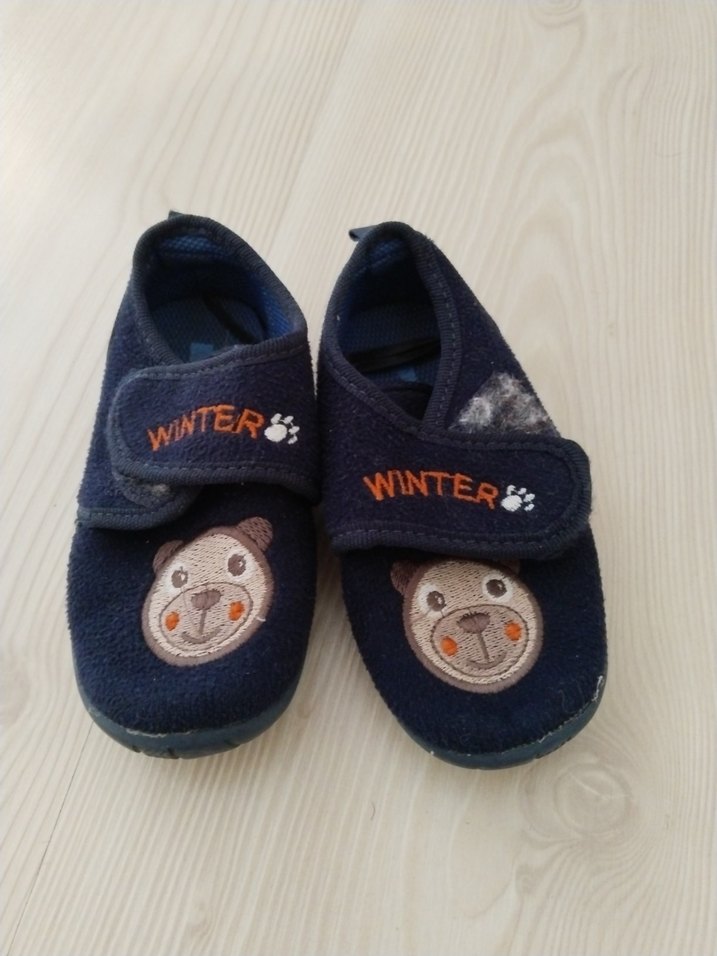 Erkek çocuklar için yumuşak ve sıcak fleece terlikler, kolay giyim için cırt cırtlı bantlı. Lacivert, ayı desenli ve "WINTER" nakışlı. ❄️