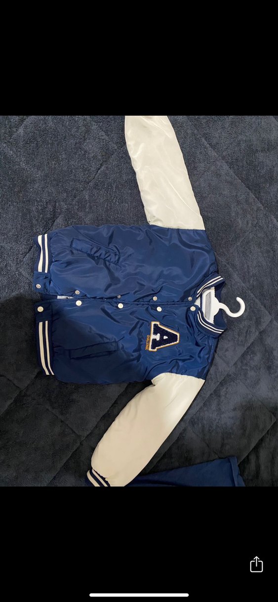 Lacivert gövde ve beyaz kollara sahip, düğmeli ve kesik yakalı, dar kesim erkek çocuk ceketi. Pürüzsüz sentetik kumaştan, spor ve gündelik tarzda.