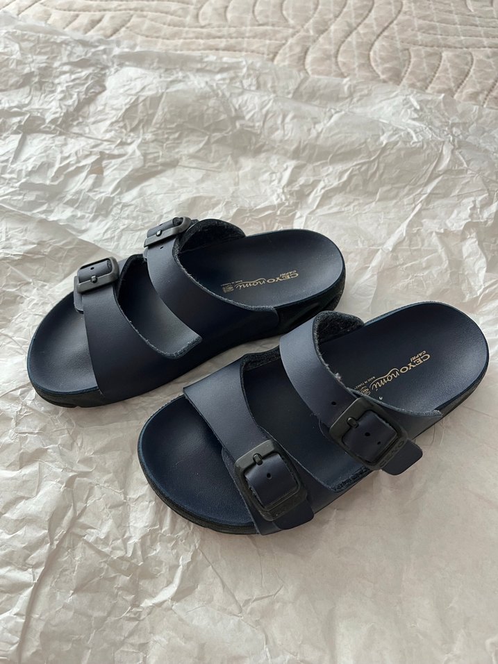 26 numara Erkek terlikler, iki ayarlanabilir tokalı kayış ve yumuşak kauçuk tabana sahip, koyu lacivert renkte, günlük kullanım için uygundur.