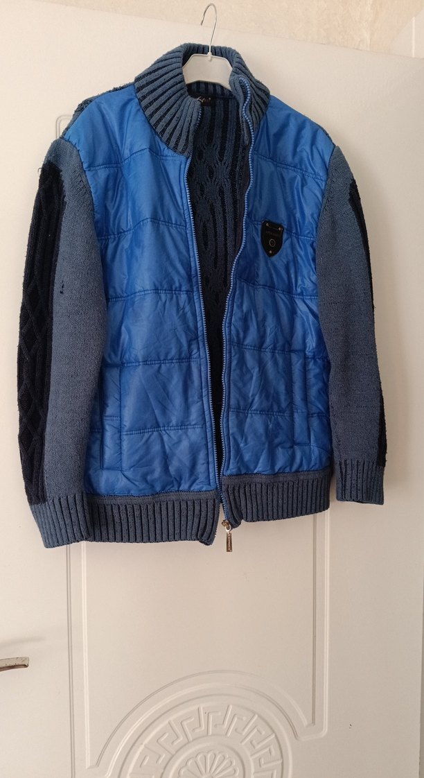 Fitted kesim erkek çocuk ceketi, triko örgü kollar ve mavi kapitone ön kısmıyla birleşir. Yaka tipi çentikli ve desen içermeyen sokak stili bir modeldir.