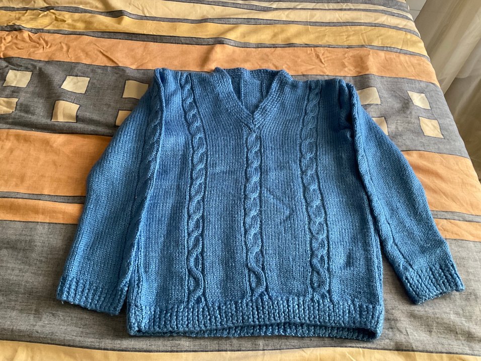 Erkek çocuklar için lacivert renkte, örgü kumaştan, bol kesim, uzun kollu ve V yakalı sade kazak.