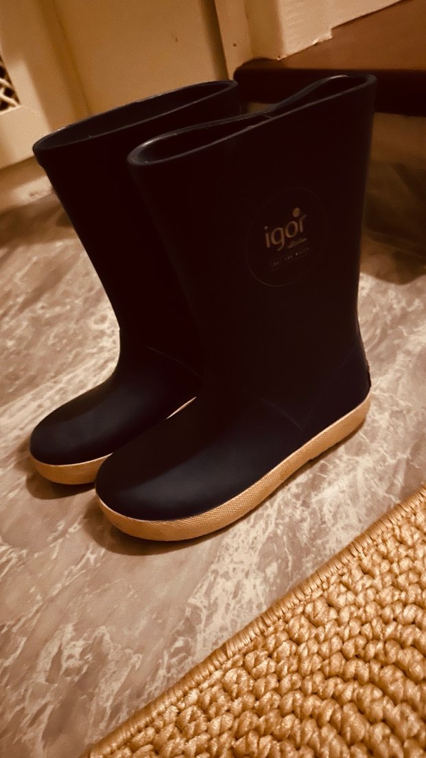 Koyu kahverengi lastik malzemeden erkek çocuk botları, desen içermeyen sade tasarıma sahiptir. Kolay kullanım için Velcro kapamalıdır ve "igor" markasını taşır.