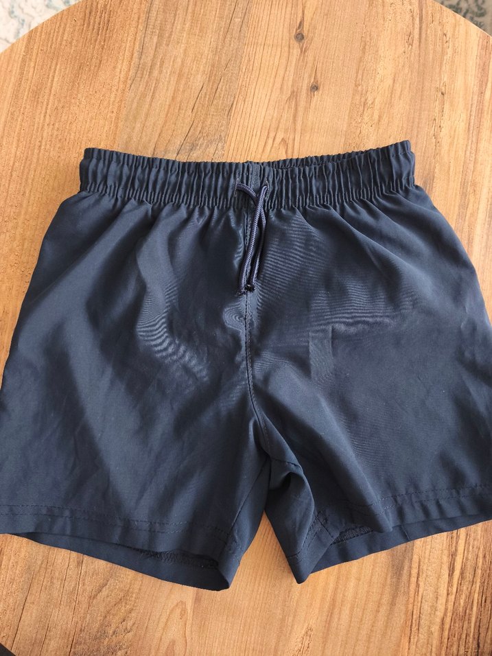 Ayarlanabilir bağcıklı, lastikli bel bantlı koyu mavi erkek çocuk yüzme şortu. Hızlı kuruyan, yumuşak dokulu kumaş.
