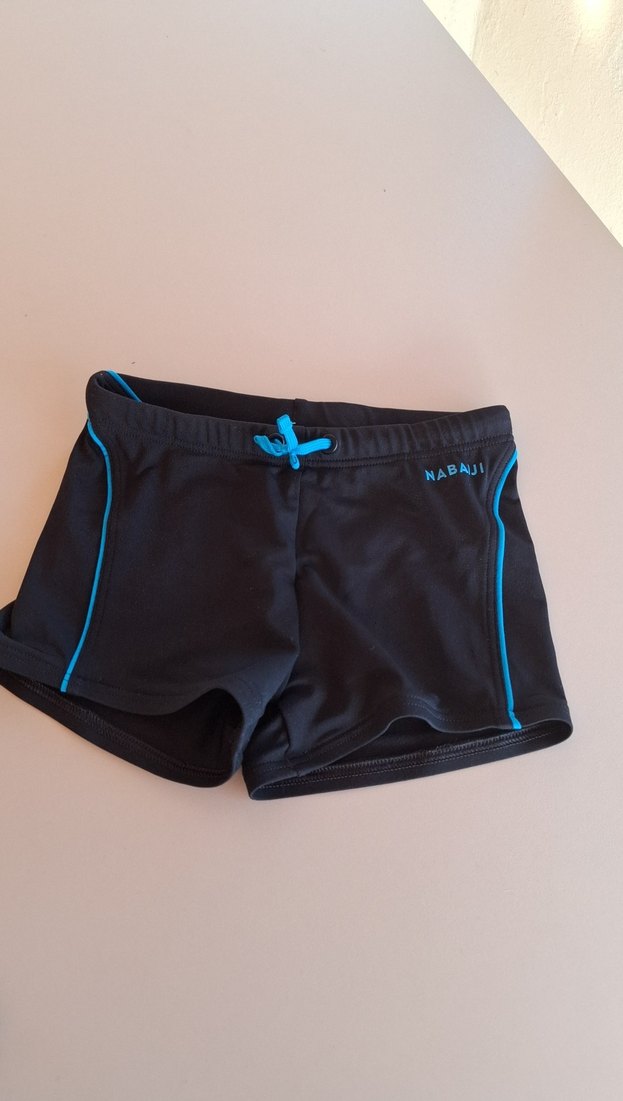 Decathlon markalı, ayarlanabilir bağcıklı koyu lacivert erkek çocuk yüzme şortu, parlak mavi şerit detaylıdır. Rahat kullanım sağlar.