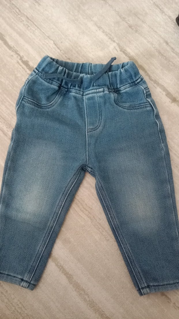 Erkek çocuklar için lastikli bel kısmı olan mavi denim pantolon. Rahat ve düz desensiz, normcore tarzda kesim.bol kalıp