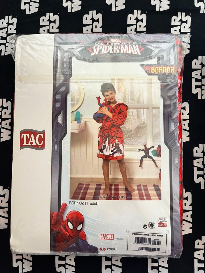Marvel Örümcek Adam desenli kırmızı erkek çocuk bornozu, canlı koyu renk ve baskılı süper kahraman figürlerine sahiptir. ️ 4-6 yaş içindir