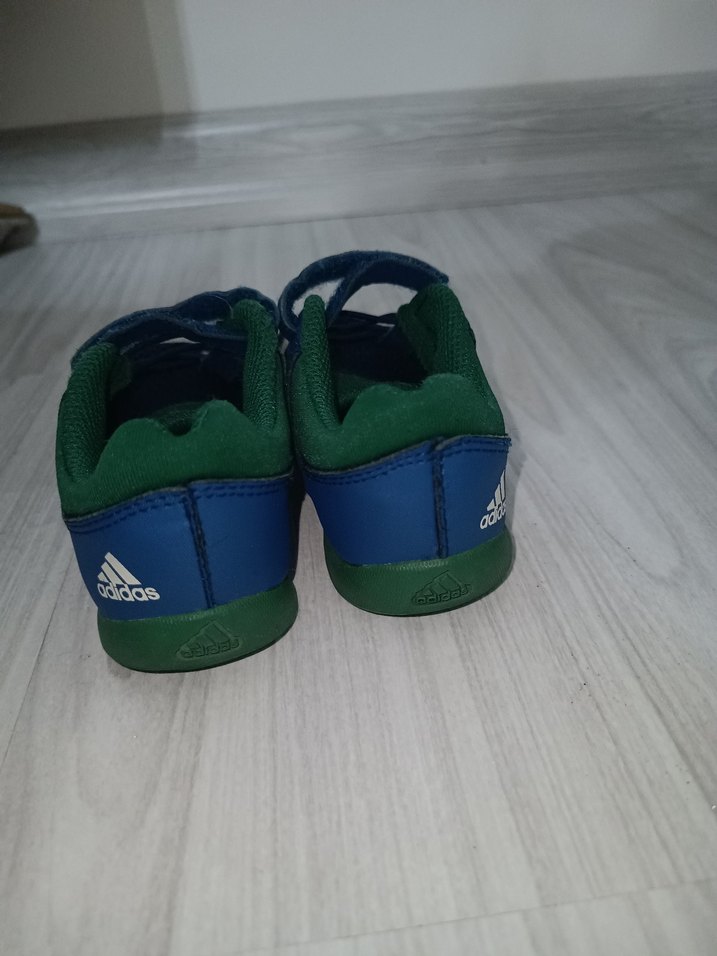 Adidas marka, mavi ve yeşil renkli, cırt cırtlı ve kauçuk tabanlı erkek çocuk sneaker'ı, sokak tarzına uygun. Az kullanıldı.