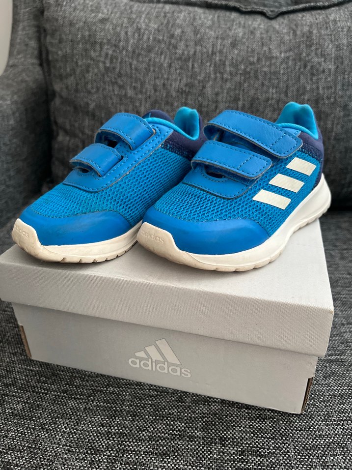 Mavi Adidas erkek çocuk spor ayakkabısı, cırt cırtlı ve baskılı tasarımlı, dayanıklı kauçuk tabanlıdır. Trend sokak stili için uygundur. 21 numara az giyildi bebekler sürekli bebek arabasında olduğu için yıpranma olmuyor temiz faturalı orjinal ürün