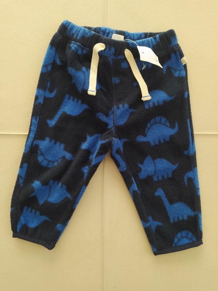 Erkek çocuklar için rahat kesim, koyu mavi bağcıklı ve dinozor desenli pantolon. Yumuşak ve sıcak kumaştan, ayarlanabilir bel bağcığı ile.