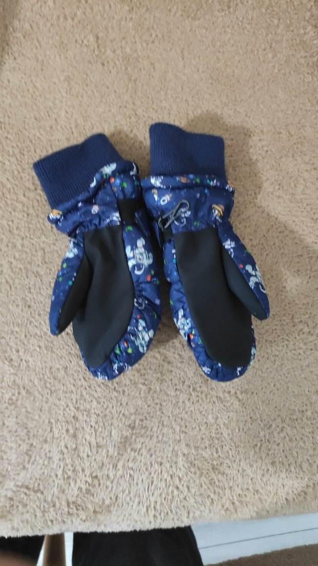 Koyu mavi bağcıklı desenli, içi yumuşak kumaşlı erkek çocuk eldiveni, cırt cırtlı kapanışlı, günlük kullanıma uygun.