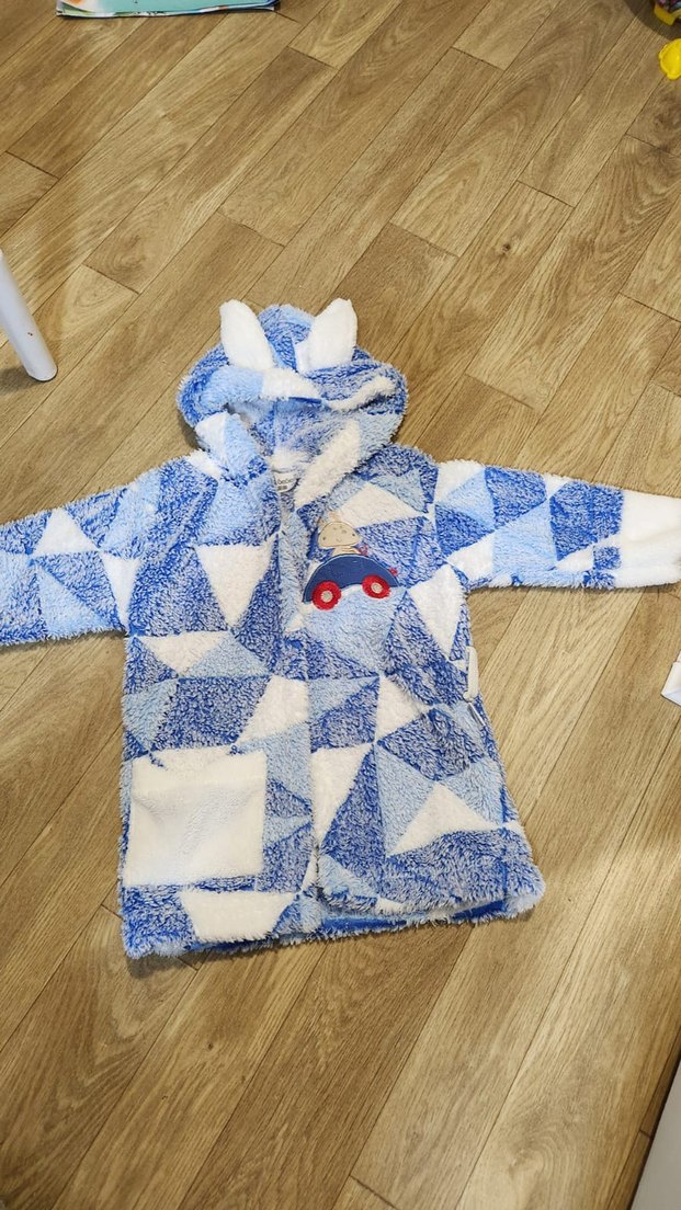 Renkli mavi bağlama desenli erkek çocuk bornozu, yumuşak peluş kumaşlı, kapüşonlu ve sevimli kulaklıdır. Ön cepleri ve göğüste kırmızı araba detaylıdır.